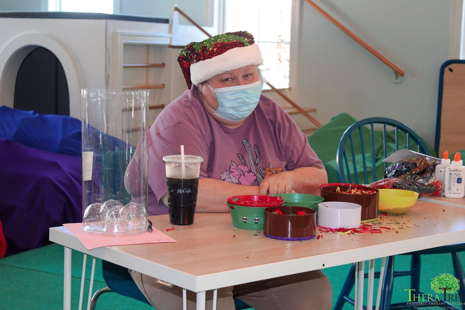 Draven is crushing his hand strengthening and fine motor goals. He is increasing his hand strength by ripping paper for this Santa hat craft!! Hand strength is needed for so many tasks like handwriting and self-care. Way to go Draven - we are so proud of you!